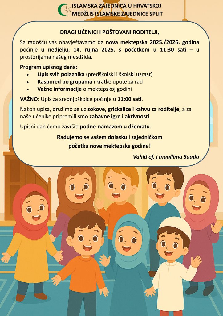 14.9.2025. bit će upisni dan povodom početka nove mektepske/vjeronaučne godine. Više možete saznati iz prigodnog oglasa.