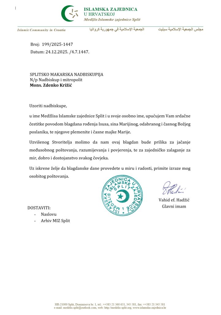 24.12.2025. Glavni imam Medžlisa islamske zajednice Split, Vahid ef. Hadžić uputio je prigodnu blagdansku čestitku mons. Zdenku Križiću, splitsko-makarskom nadbiskupu i metropolitu. Sadržaj čestitke možete pogledati u nastavku.