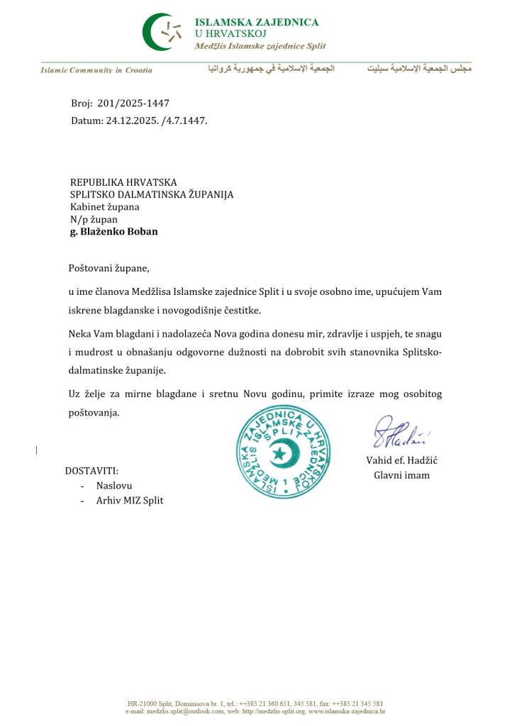 24.12.2025. Glavni imam Medžlisa islamske zajednice Split, Vahid ef. Hadžić uputio je prigodnu blagdansku čestitkužupanu Splitsko-dalmatinske županije, Blaženku Bobanu. Sadržaj čestitke možete pogledati u nastavku.