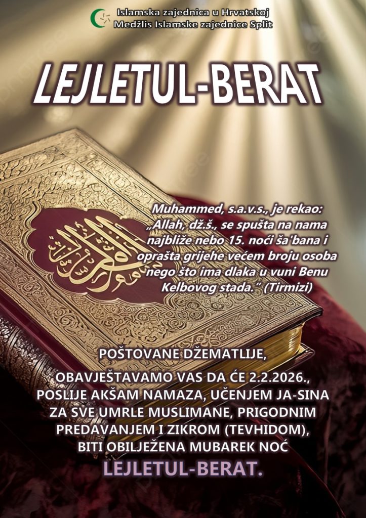 obavještavamo vas da će se u nedjelju, 2. veljače 2026. godine, poslije akšam-namaza, u našem džematu obilježiti mubarek noć Lejletul-berat.