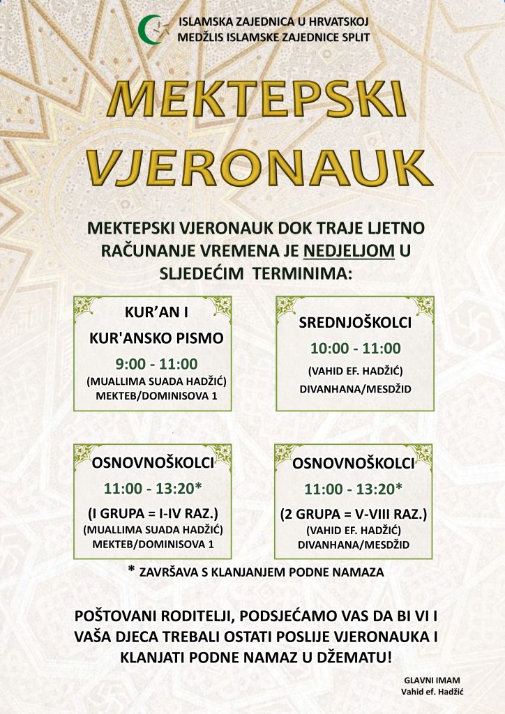 Obavještavamo sve polaznike mektepskog vjeronauka i njihove roditelje da dolazi do promjene termina održavanja nastave mekteba nedjeljom, zbog prelaska na ljetno računanje vremena.