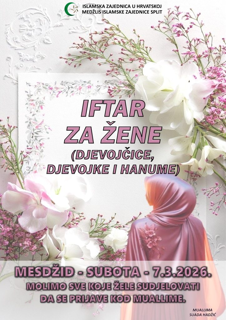 Nakon lijepog i toplog druženja koje je obilježilo prvi iftar za žene u našem džematu, sa zadovoljstvom najavljujemo drugi zajednički iftar za hanume u prostorijama Medžlisa Islamske zajednice Split.