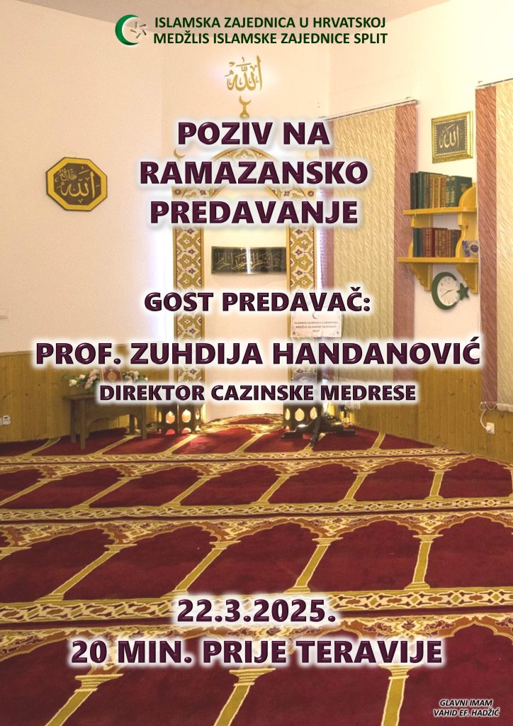 U subotu, 22. marta 2025. godine, naš medžlis imat će čast ugostiti prof. Zuhdiju Handanovića, direktora medrese "Reis Džemaludin-ef. Čaušević" u Cazinu. Prof. Handanović dolazi kao ramazanski predavač ispred Islamske zajednice u Bosni i Hercegovini, a njegovo predavanje bit će prilika za duhovno nadahnuće i produbljivanje spoznaja o vjeri.