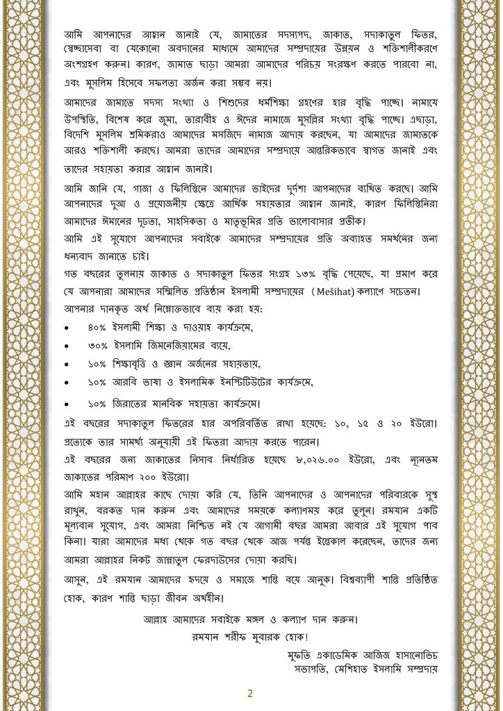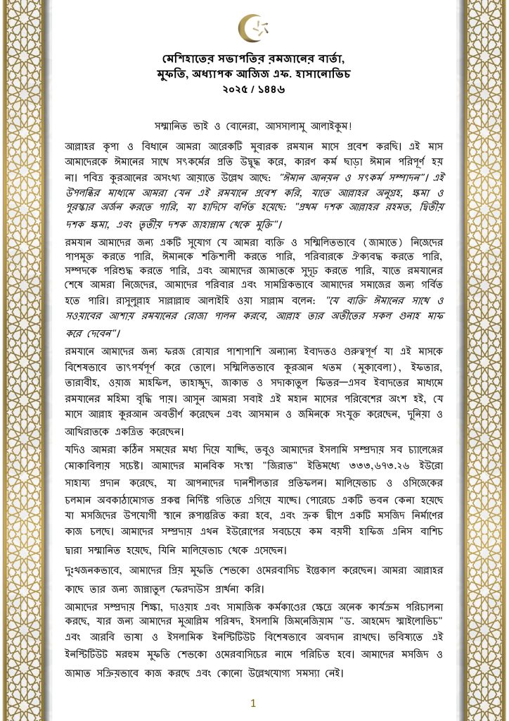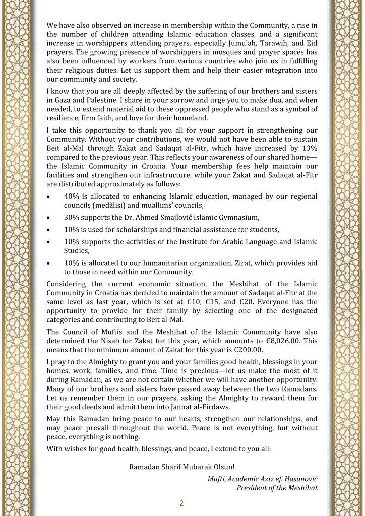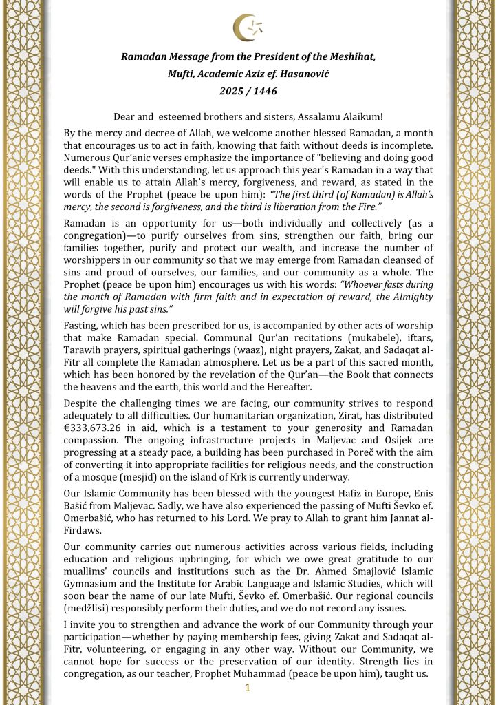 Ramazanska poruka predsjednika Mešihata Islamske zajednice u Hrvatskoj muftije akademika Aziz ef. Hasanovića u prijevodu na engleski i bengali za strane radnike